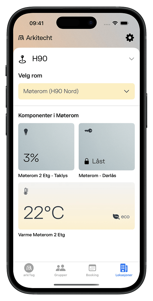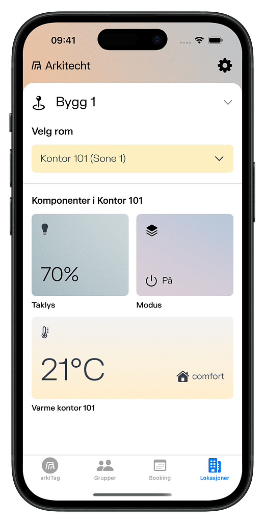 I tillegg fungerer arkiTag som en snarvei til kontroll av rommets funksjoner som lyd, bilde, lys og varme – dersom disse er tilgjengelige for brukeren.
